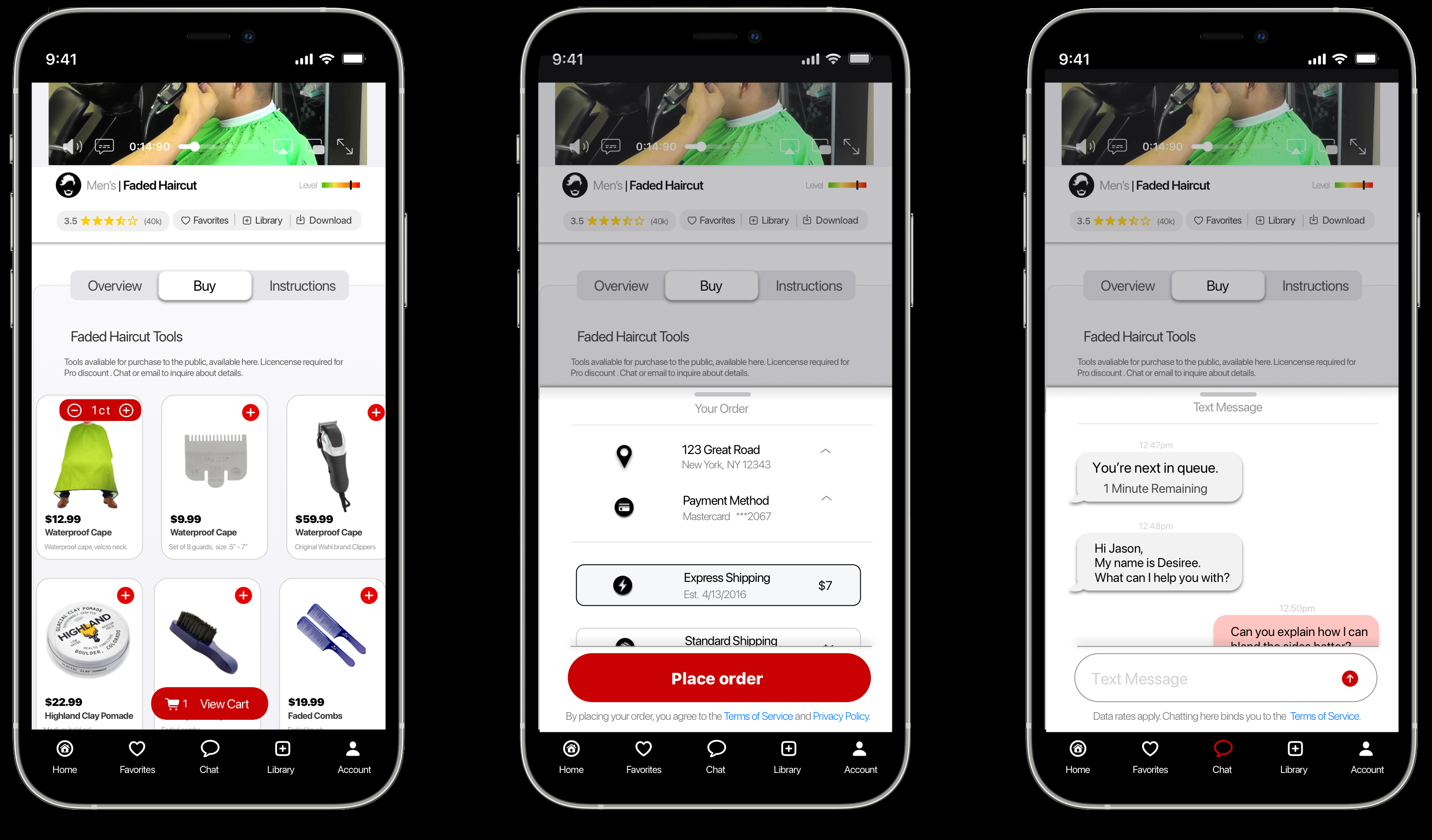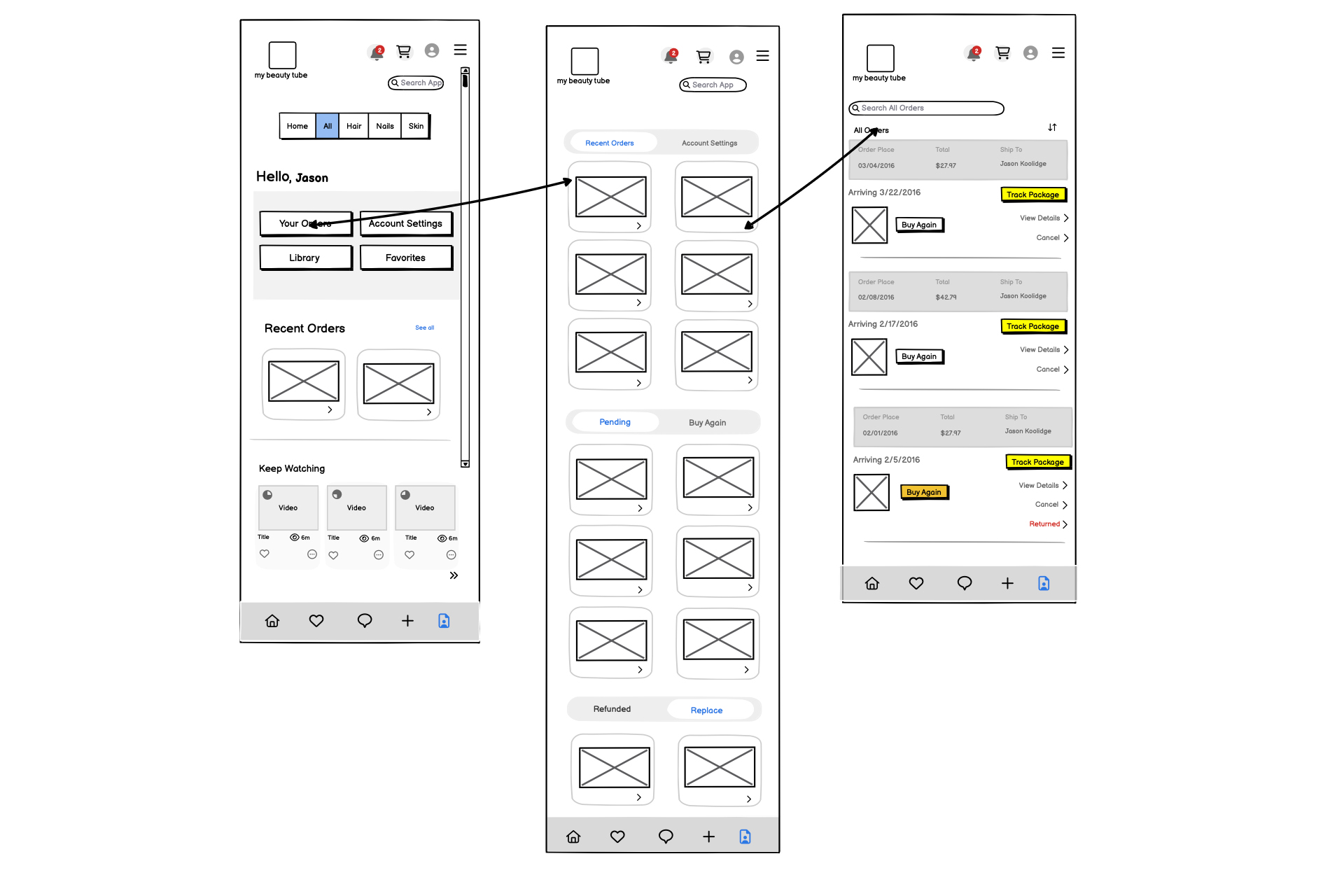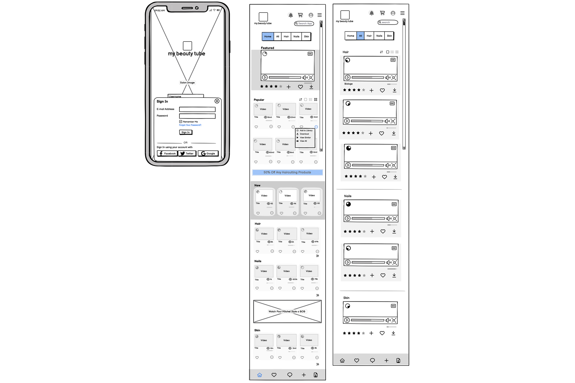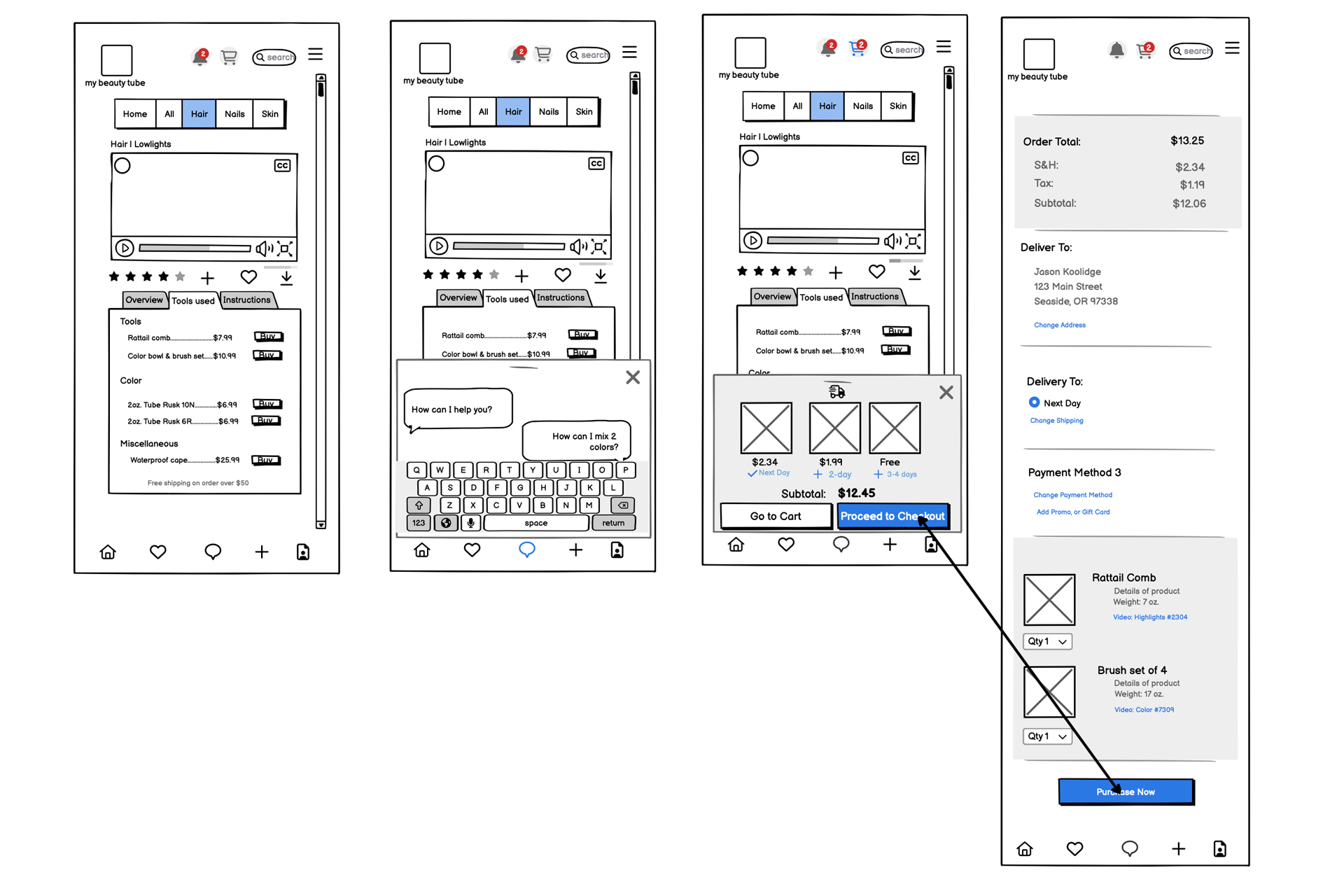 As part of the initial launch of a My Beauty Tube tutorial platform, this wireframe series illustrates the buying process for professional tools and products showcased in instructional videos. The goal was to design an intuitive and streamlined purchase experience from the outset, informed by extensive user research.
