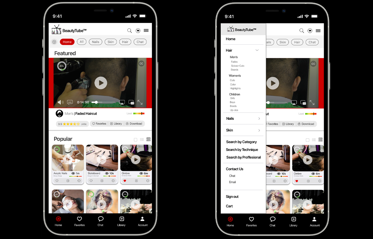 The Library section serves as a centralized location where users can find a curated list of videos they intend to watch, providing a convenient way to organize and access content. The videos are arranged in a specific hierarchy on the Home Screen, with "Featured" videos displayed prominently at the top, followed by "Most Popular," then categories such as Hair, Nails, and Skin.